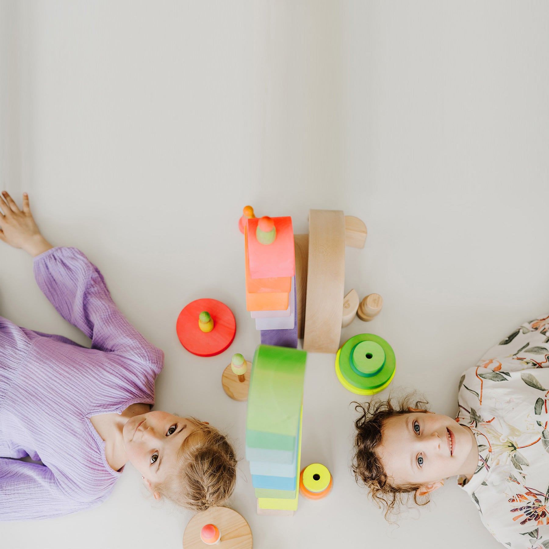 Is this art ... or can you play with it? Well, both! The Conical Tower is a must-have in the toddler's room. But of course it can also be artistic! After all, children have a very keen sense of colour and harmony. And the adults are happy when the toy is appealing to the eye and enriches the home as an attractive ornament. So it's a win-win for young and old, we think! The Conical Tower invites sorting by colours and sizes, stacking and creative building. Playing with it trains the motor skills of little ones and creates joy by combining the bright colours with the natural wood tones.