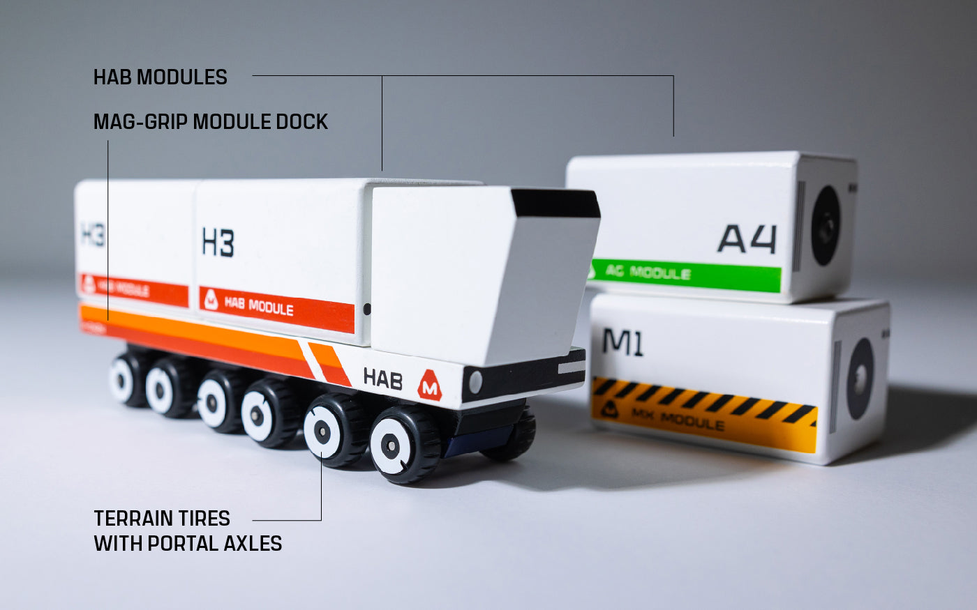 The HAB Transporter is an essential vehicle for the settlers of Mars. Equipped with a suspension base, this vehicle transports many modules for the MARGE crew.