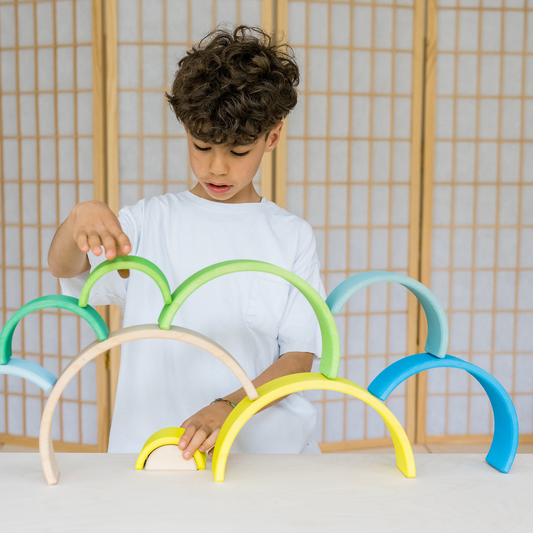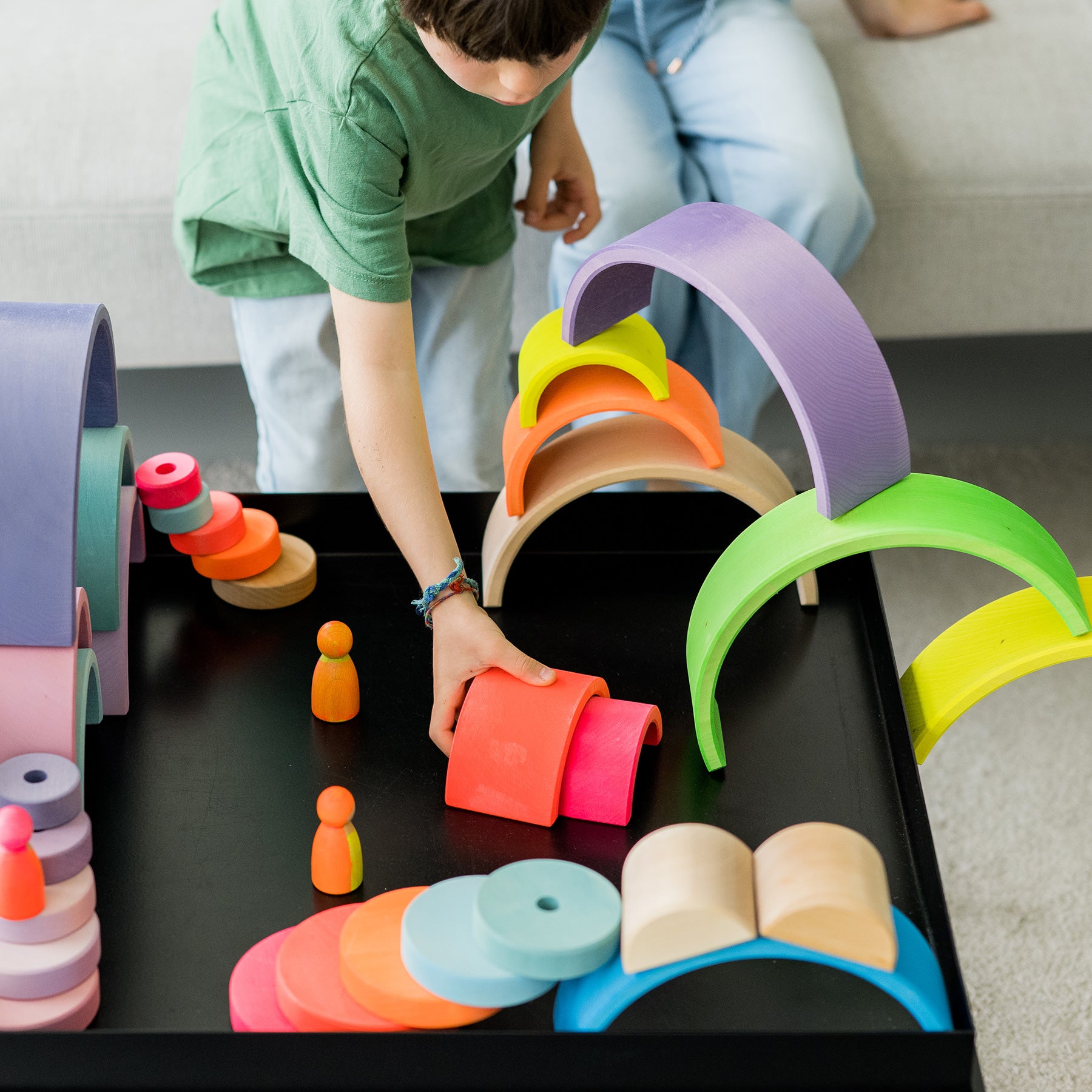 Our classic stacker looks great in any colour and so of course had to be included in our Neon Collection! It consists of 10 arches, creating a strong contrast with colours ranging from gaudy neon to soothing natural tones. This makes it not only an incredibly versatile toy for stacking, building, sorting and free play for children, but also a stunning centre piece for adults.
