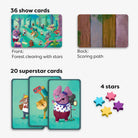 - What’s in the Box: 36 show cards (front: forest clearing with 12 stars; back: scoring path), 20 superstar cards, 4 colored wooden stars, rulebook