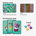 • What’s in the Box: 36 show cards (front: forest clearing with 12 stars; back: scoring path), 20 superstar cards, 4 colored wooden stars, rulebook