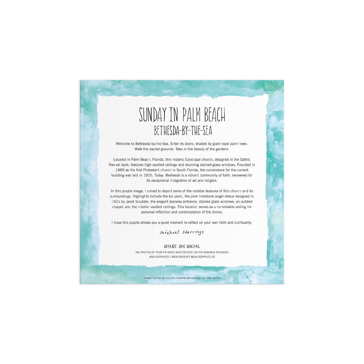 Celebrate the beauty and spirit of the season with Galison's Sunday In Palm Beach 500 Piece Puzzle. Featuring a charmingly detailed painting by award-winning artist Michael Storrings, this puzzle captures the joyful energy of a Sunday morning - complete with blooming flowers, festive decorations, and the picturesque Bethesda church. As you bring the scene to life piece by piece, you'll be swept into a world of color, community, and renewal.