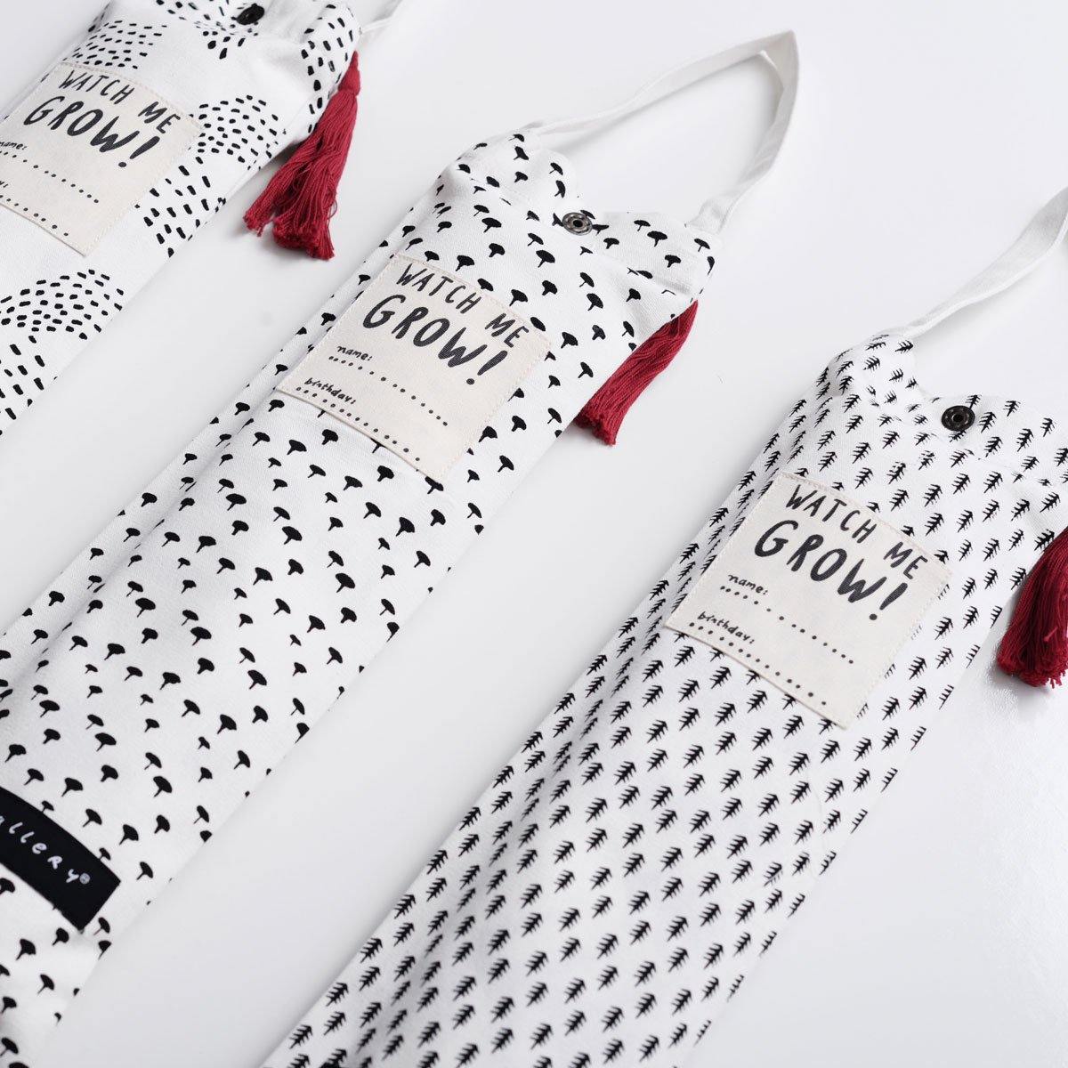This growth chart features sweet animal faces that smile as your little one grows Ethically and sustainably made in India using screen printing on organic cotton canvas, finished with a waxed cotton twine hanging cord and stylish fringe end. Comes in a special keepsake bag with a place for your child's name and birth date.