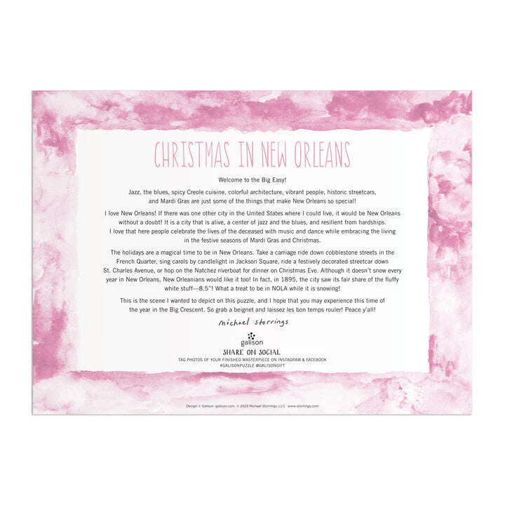 Award-winning designer, illustrator, and creative director Michael Storrings captures the holiday spirit in the French Quarter of New Orleans in Michael Storrings Christmas in New Orleans 1000 Piece Puzzle.