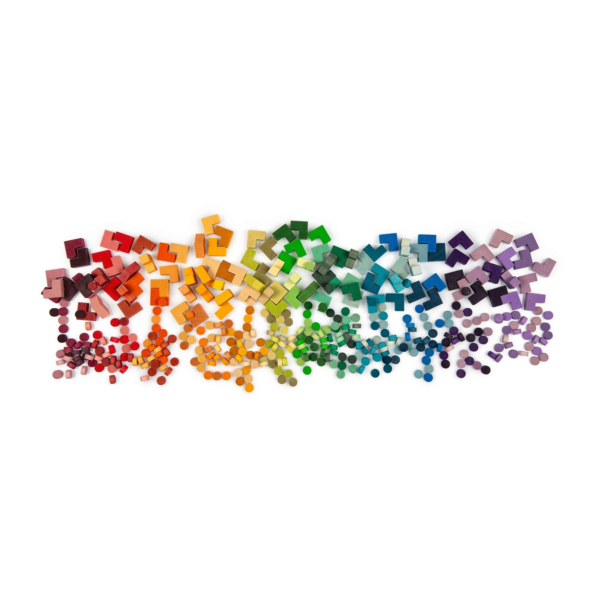 400+ small wooden pieces in two shapes and 36 gradient colours of the rainbow. Includes a GOTS certified cotton bag.