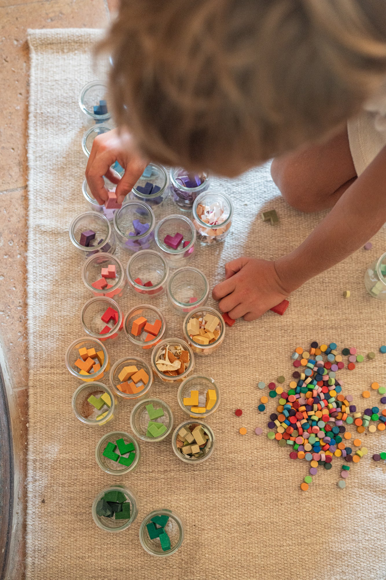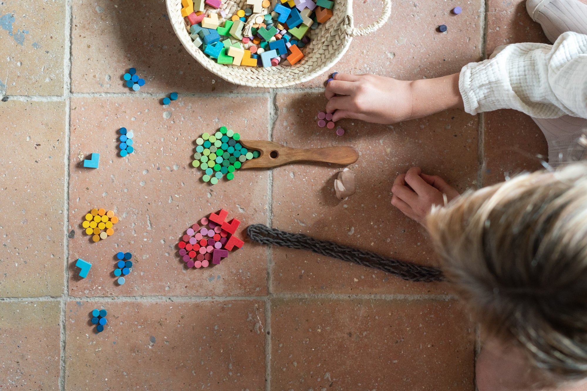 Bloom is a colorful collection of wooden dots and L-Shaped wooden forms. It can be used to create freely, for mosaics or to experience geometrical concepts. It completes the “Mis and Match box”, by adding richness to your creations.