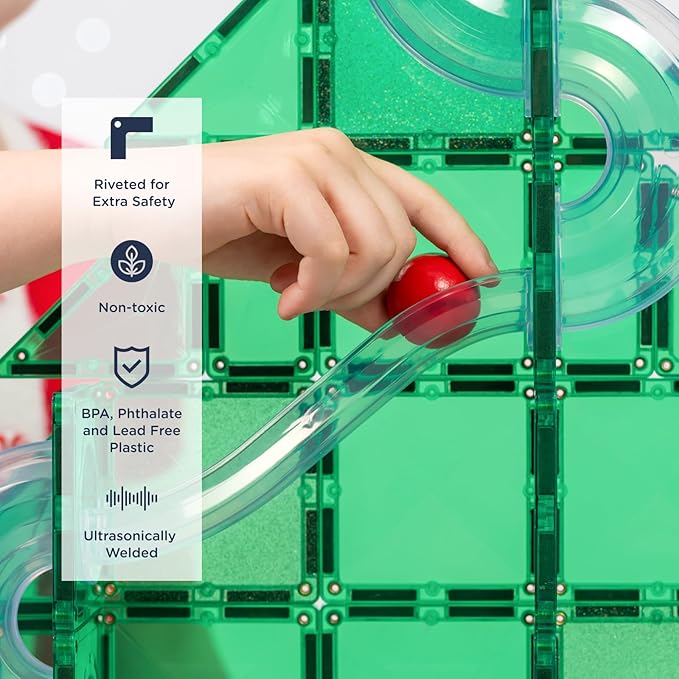 Unwrap hours of open-ended play and learning with Christmas Ball Run 71 piece FUN for everyone. This limited-edition pack features exclusively designed clear fluted tubes in an exciting range of pieces, including straights, slides and spirals to bring the joy of whirling, twirling ball run play this festive season. Showcasing a handpicked selection of magnetic tile shapes and connector squares in the traditional Christmas colours of green, red and yellow, plus adding a touch of magic with a combination of green glitter tiles this pack has everything you need to create a sparkling tree. Best of all, you can rebuild and enjoy it for years to come!