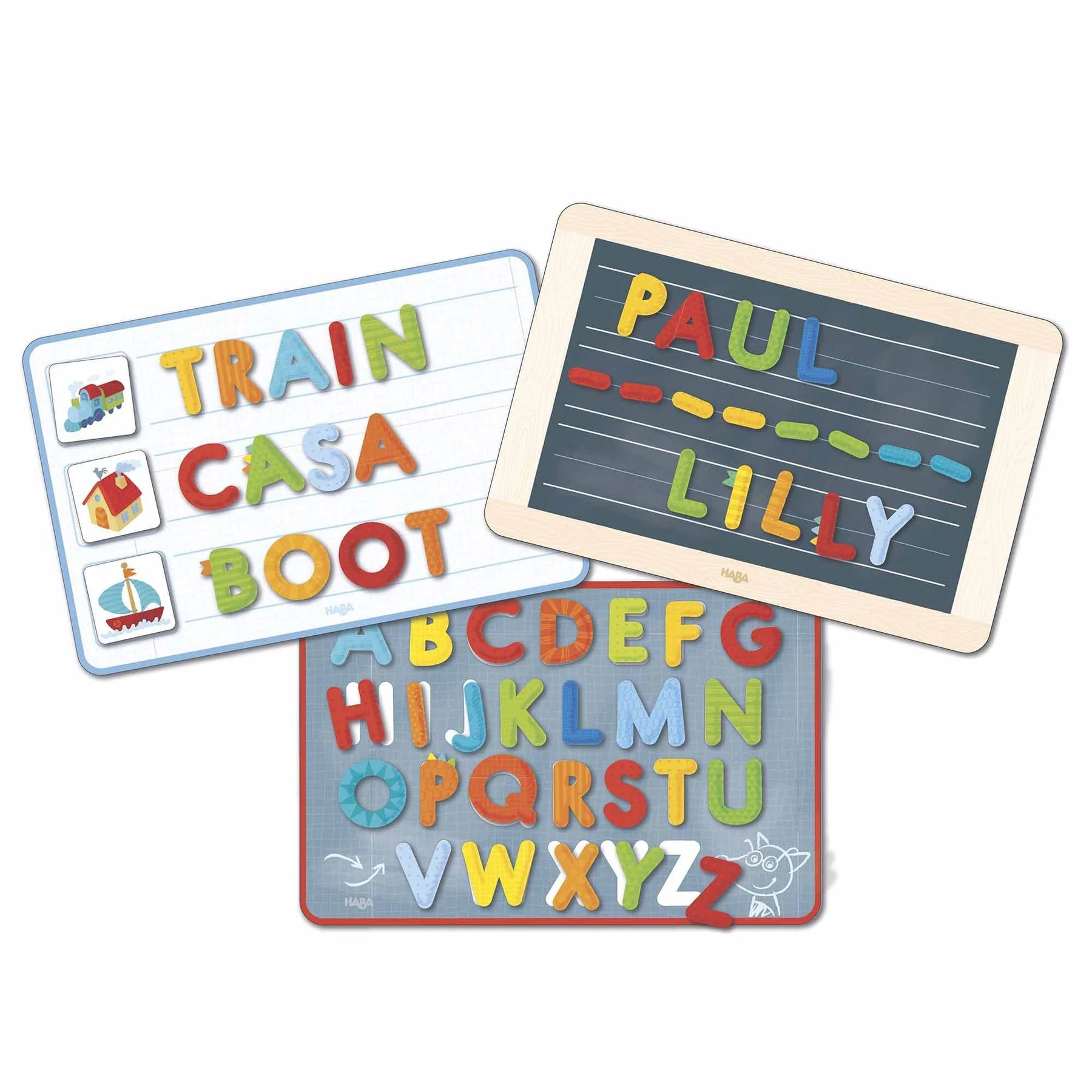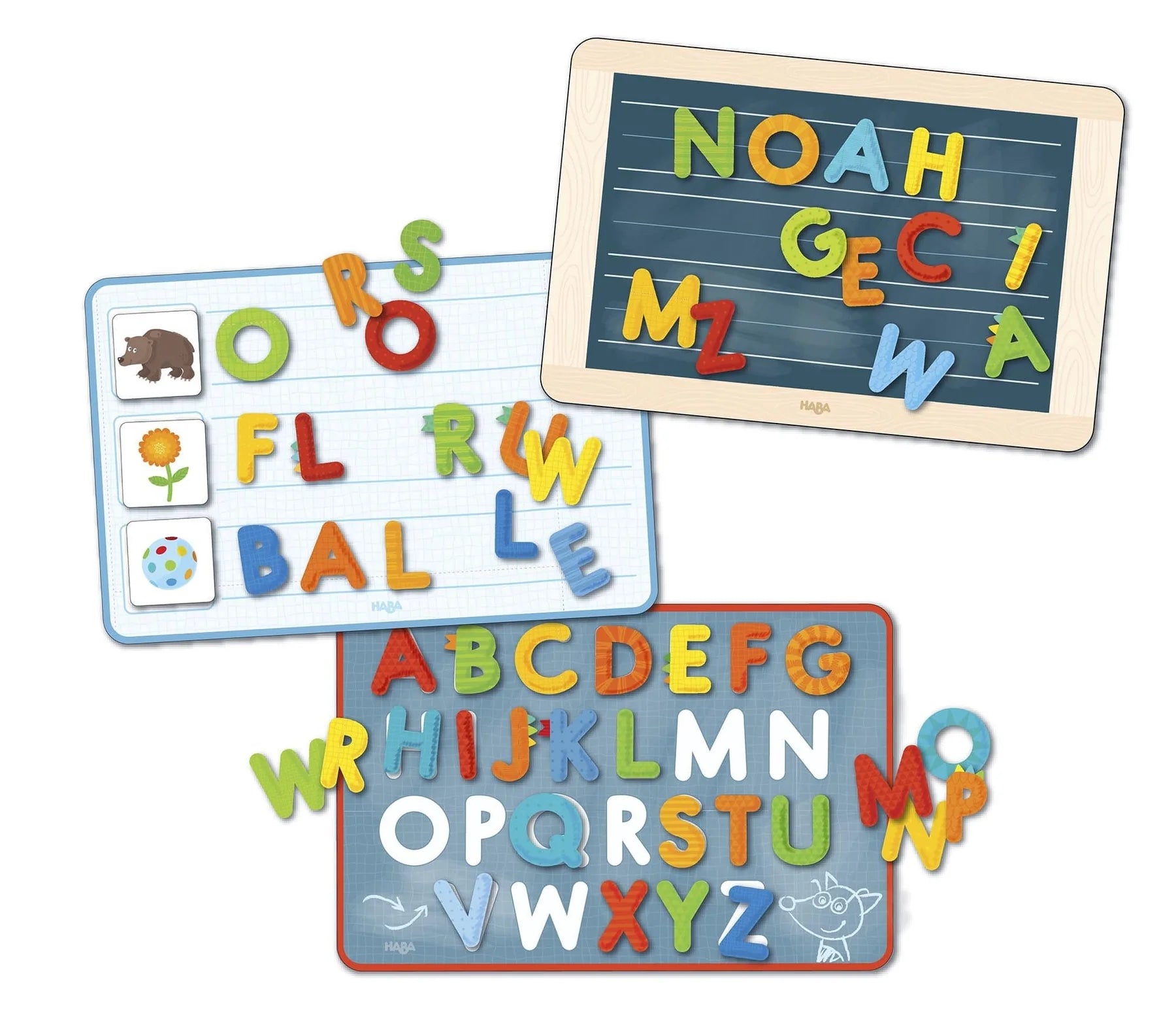 Welcome to Letterland! This cheerful letter arranging game playfully introduces your child to the alphabetical world of letters and spelling. A great selection of motifs invites children to go on a lark with letters. The handy cardboard carrying case and magnetic pieces make this set ideal for travel.