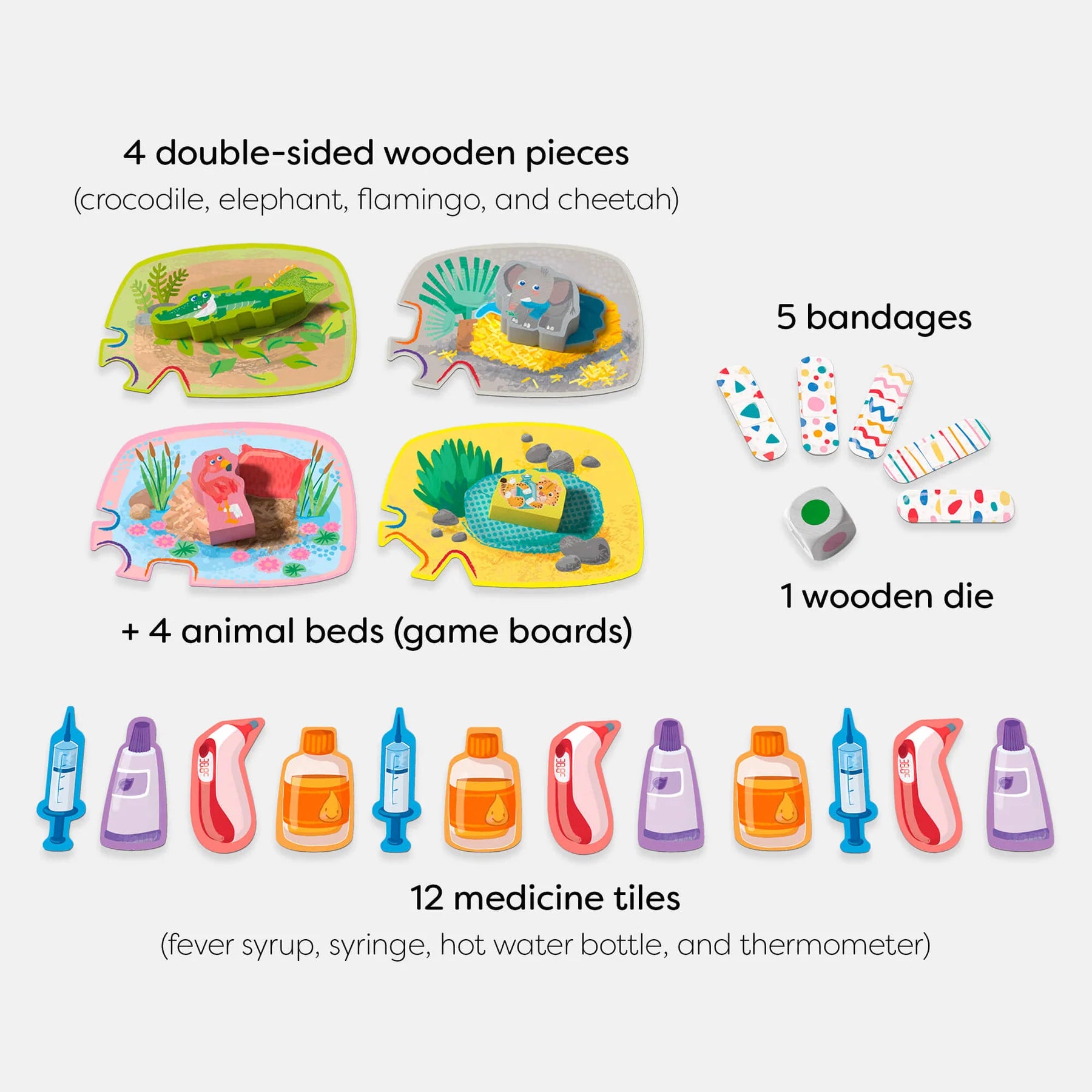 The animals need your help! It’s time to treat the sick crocodile, elephant, cheetah, and flamingo. Each animal has a unique ailment, and it’s up to the little veterinarians to provide the right care. Can you assign the correct medicine and be the first to heal all the animals?