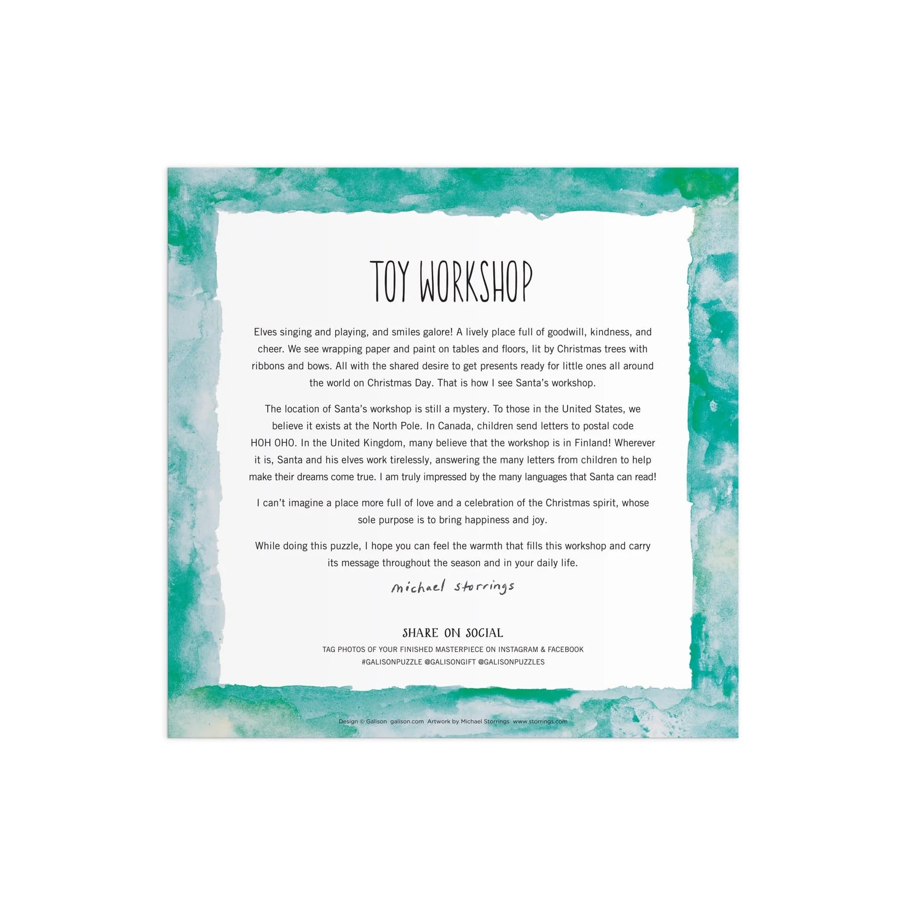 Michael Storrings Toy Workshop 500 Piece Puzzle by Galison features the spirit of a toy workshop, embellished with frosty foil accents.