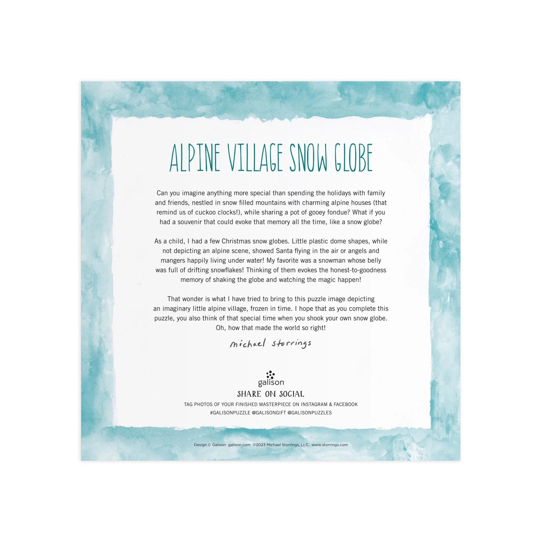 The Michael Storrings Alpine Village Snowglobe 500 Piece Foil Puzzle from Galison features an dreamy illustration of an imaginary alpine village snowglobe nestled in snow-filled mountains. Opalescent foil accents on this 500 piece puzzle capture drifting snowflakes, frozen in time