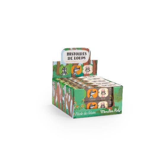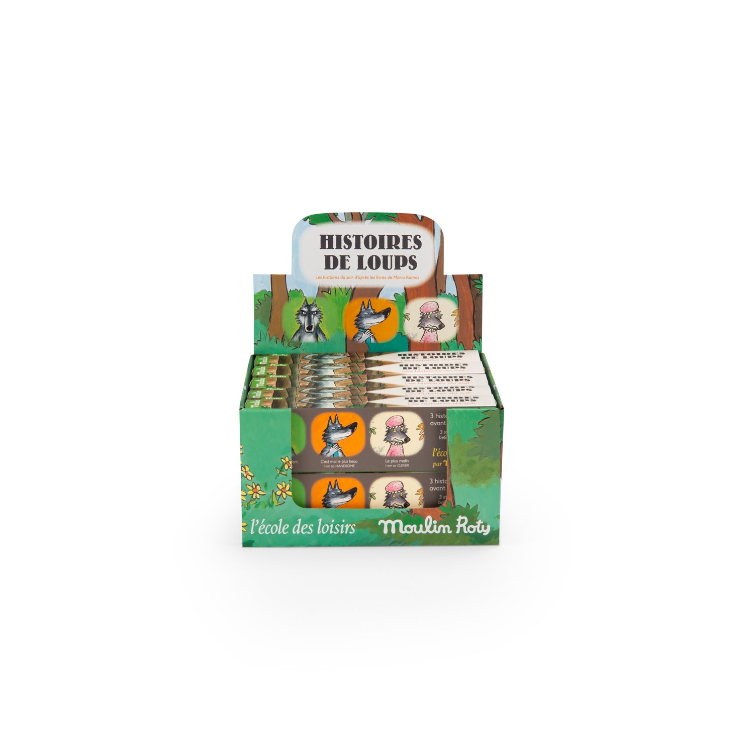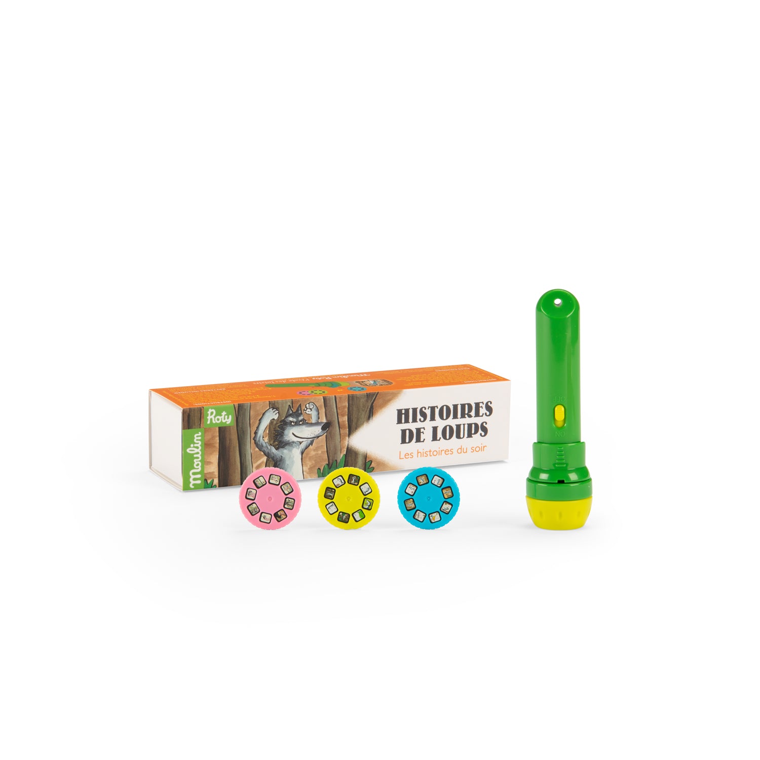 Lampe torche de poche où chacun des 3 disques projetés sur le mur raconte les aventures du Loup, héros de l'école des loisirs, pour imaginer de belles histoires. Collaboration avec la maison d'édition Ecole des loisirs. Auteur et illustrateur : Mario Ramos