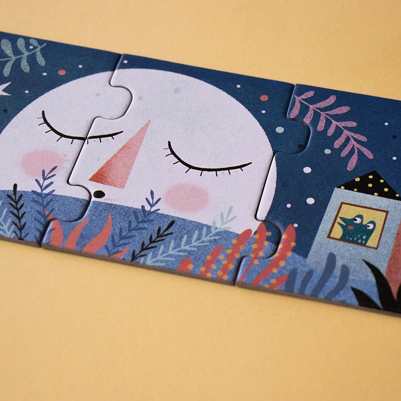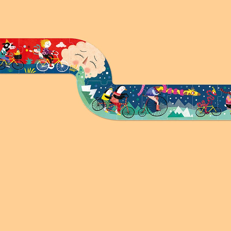 Puzzle of 54 pieces and 3 meters long of a bicycle tour and the cyclists who travel the route. A sustainable toy made in Europe.