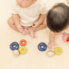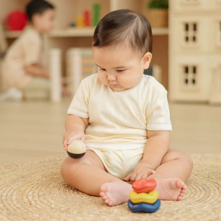 "This wave-shaped stacking toy invites open-ended exploration with mix-and-match pieces that are satisfying to grip. Without a central pole, children can stack freely, experimenting with balance and sequencing. The included bell ball enhances auditory development, encouraging focus on sound. Waves interlock in multiple ways—vertically and horizontally—fostering problem-solving, logical thinking, and fine motor skills. Each ring features a center hole for added threading play. Set includes: 1 ball and 3 wavy rings."