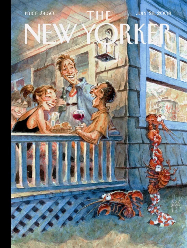 Summer Getaway - New Yorker Cover by Artist Peter de Seve, originally published on July 28th, 2008. The covers of The New Yorker have entertained and enlightened the magazine's readers for nearly a century. With unmatched visual sophistication and wit, they let no subject escape their scrutiny. A roster of extraordinary artists continues to create indelible images that are infinitely varied in style and tone, whether whimsical, provocative, serene, or lough-out-loud funny. From the iconic Eustace Tilley to spot-on images of contemporary life, The New Yorker's covers are always the talk of the town.