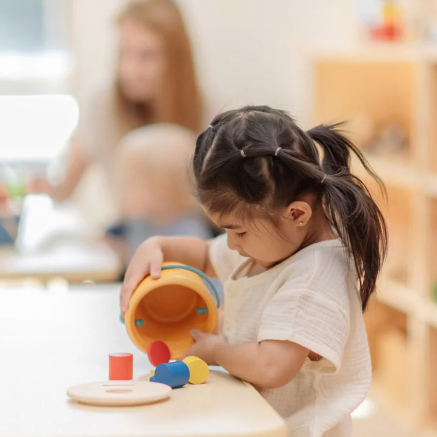 "This shape-matching toy enhances hand-eye coordination and fine motor skills as children grasp and fit pieces into corresponding slots, refining precision and wrist control. It teaches shape recognition, problem-solving, and introduces the concept of object permanence, helping children understand that objects continue to exist even when temporarily out of sight. The lid opens for added engagement, while the bucket’s handle makes it easy to carry, promoting independent play. Children also develop an understanding of shapes while practicing grasping and placing objects. Set includes: 1 bucket with a lid featuring 2 holes and 6 blocks (3 coin-shaped and 3 cylinder-shaped in yellow, blue, and red)."