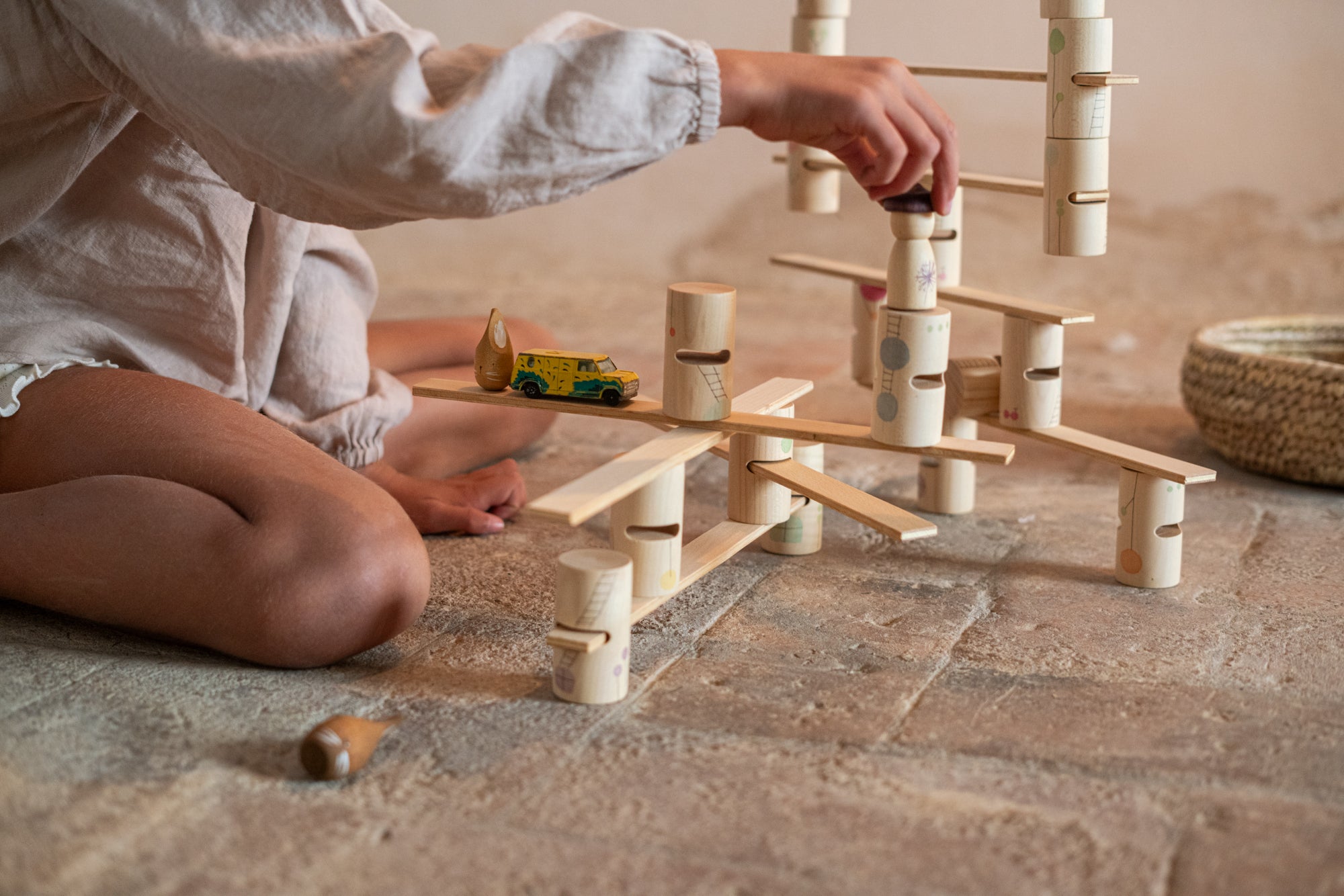 GRAPAT provides material without instructions, open-ended and autonomous play. Their only premise is to let children play, slowly, without time limits. Grapat hand crafts materials that encourage, invite and stimulate the creation of invented little worlds. Grapat is made following traditional processes, in the old way, with thick soft raw materials, natural dyes which let the wood veins be seen and vibrant coloured waxes and oils that slightly shine. The products are painted by hand, homemade, surrounded by nature and many children nearby that inspire the makers daily.