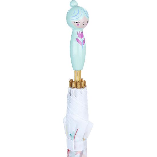 Children-sized wooden umbrellas. Very strong carbon structure and anti-pinching system. Green flower umbrella with Suzy Ultman artwork, by Vilac. Made in France. Dimensions approximately 70 cm in height. For ages 2+.