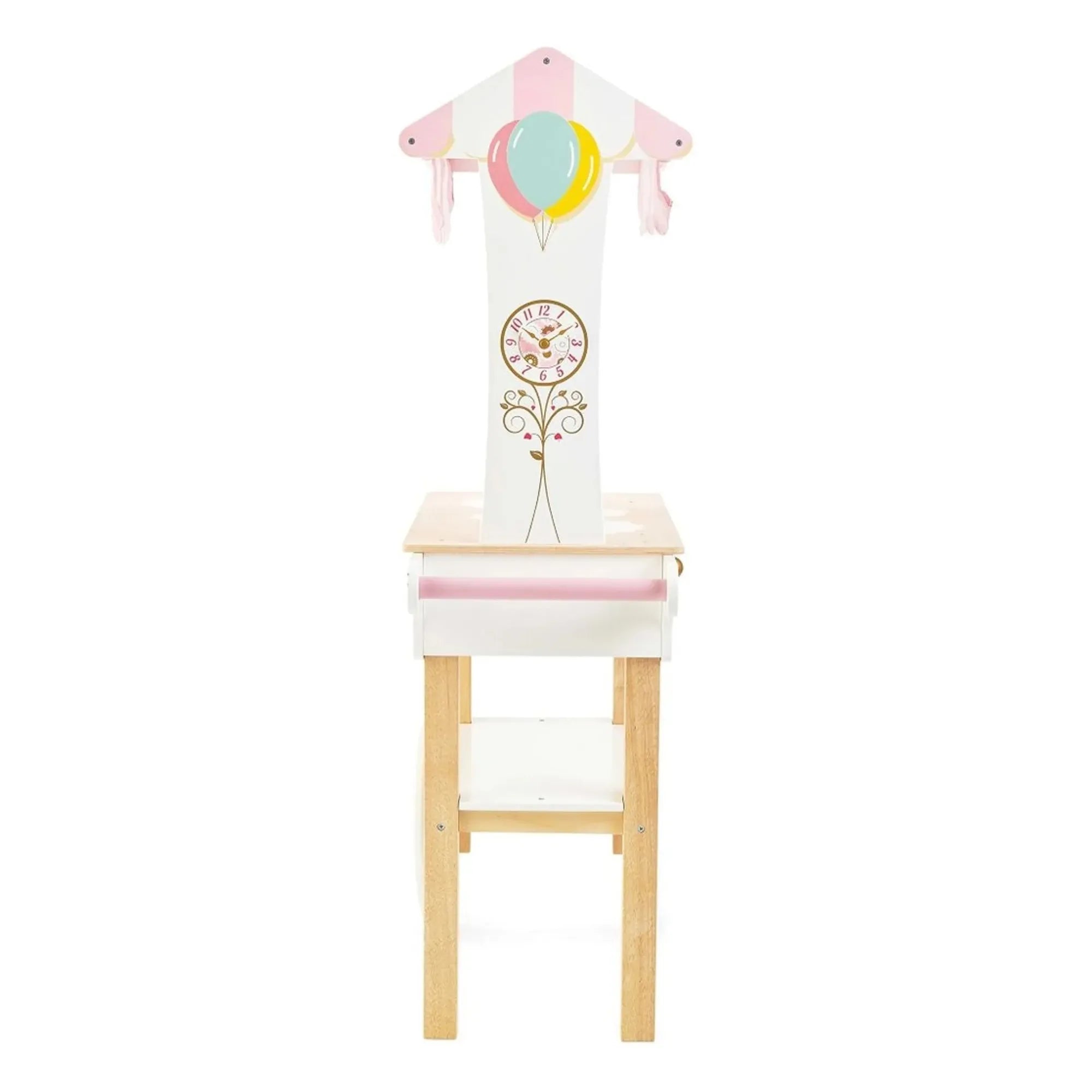 Time for Tea! Bedecked in a rose and white striped fabric canopy and featuring a secret drawer. A classic barrow style trolley with two wheels and handle. A flourish of golden paint adds a ritzy style to afternoon tea. Stimulating extensive imaginative and social play.