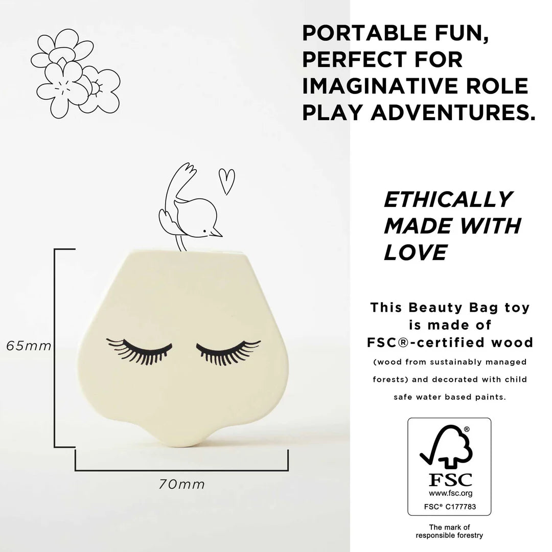 This sweet toy consists of a fabric cosmetics bag made from natural cotton, plus a host of chunky wooden make-up pieces with smooth, child-safe edges, all hand painted an appealing designs using non-toxic paints.