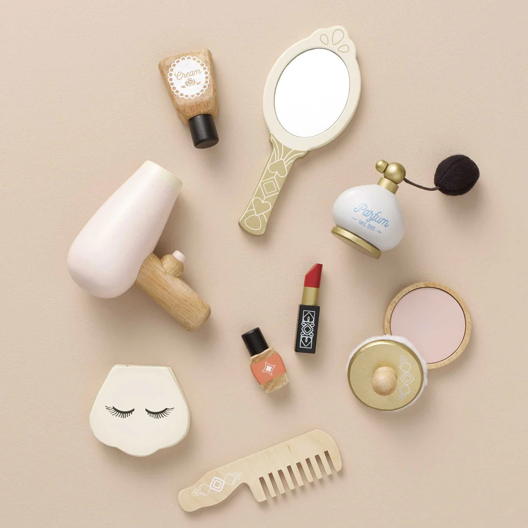 Mini make up artists will soon set to work. Elements include a vintage perfume bottle with a bulb atomiser, a hand held mirror, a hair dryer, a comb, a shell compact make up kit, a lotion, a nail varnish, a lipstick and a powder puff.